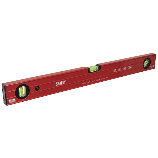 1mm Aluminium box section level. Powder coated for corrosion resistance. Accuracy 1mm in 1m (0.057°). Model includes UV resistant and shockproof vials, one horizontal with side view, one vertical and one 45°. Base with precision milled face.