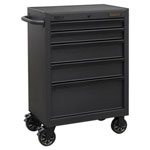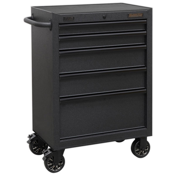 All heavy-duty steel construction and manufactured with steel inner walls for extra strength and durability. Heavy-duty 45mm ball bearing drawer slides provide superior performance, suitable for heavier loads. Full height rear locking mechanism, locks smooth running soft close drawers in place. Rust and solvent resistant black crinkle effect finish. Fitted with four Ø125mm PP wheels with black chrome effect alloys, two castors with quick release anti-rotation toe locks and two fixed wheels. Side handle for added comfort when manoeuvring around the workplace. Each drawer features stylish black anodized heavy-duty drawer pulls and pre-cut non slip liners. Supplied with two folding keys.