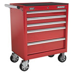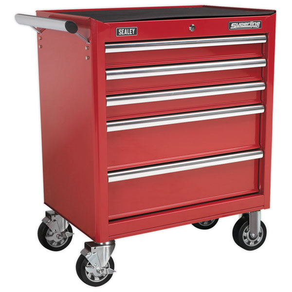 All heavy gauged steel construction and manufactured with steel inner walls for extra strength and durability. Heavy-duty 45mm ball bearing drawer slides provide superior performance and carry heavier loads. Full height rear locking mechanism, locks full-length drawers in multiple locations. Added security provided by tumbler lock, supplied with two folding keys. Rust and solvent resistant powder coat paint finish. Includes four extra-heavy-duty Ø125mm PU/PP alloy wheels, two castors with large toe locks and two fixed wheels. Features a high polished chrome handle to enable smooth manoeuvrability. Also includes a 10mm thick top mat. Each drawer features aluminium drawer pulls and non-slip liners.