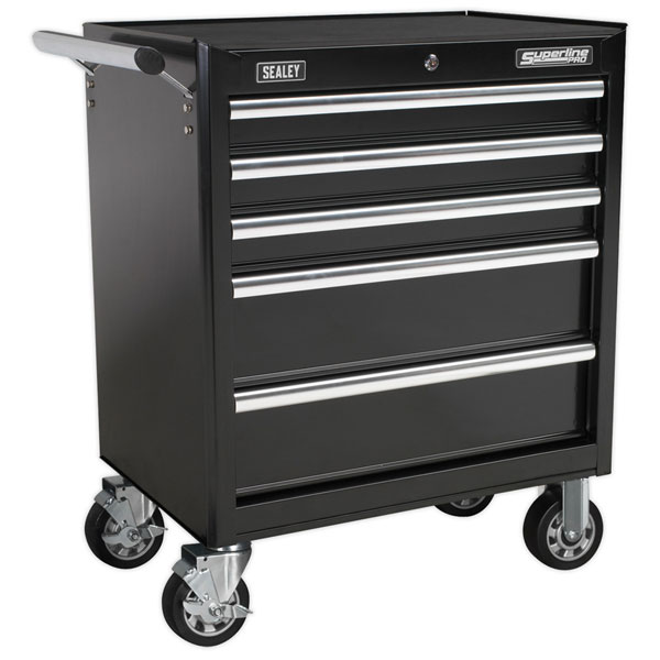 All heavy gauged steel construction and manufactured with steel inner walls for extra strength and durability. Heavy-duty 45mm ball bearing drawer slides provide superior performance and carry heavier loads. Full height rear locking mechanism, locks full-length drawers in multiple locations. Added security provided by tumbler lock, supplied with two folding keys. Rust and solvent resistant powder coat paint finish. Includes four extra-heavy-duty Ø125mm PU/PP alloy wheels, two castors with large toe locks and two fixed wheels. Features a high polished chrome handle to enable smooth manoeuvrability. Also includes a 10mm thick top mat. Each drawer features aluminium drawer pulls and non-slip liners.