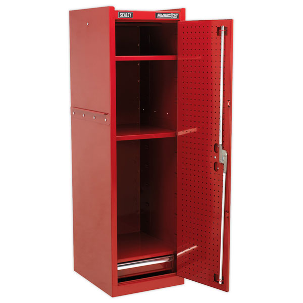 All heavy gauged steel construction and manufactured with steel inner walls for extra strength and durability. Full height rear locking mechanism, locks full-length drawers in multiple locations. Added security provided by tumbler lock, supplied with two folding keys. Rust and solvent resistant powder coat paint finish. Hang-on locker suitable for Superline PRO® 12 and 16 drawer rollcabs. Features two adjustable shelves and a lockable drawer.