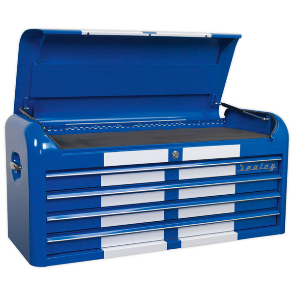 Extra-wide retro styled topchest with modern day functionality. Features four drawers with 45kg ball bearing slides and aluminium trimmed 'Lift & Latch' drawer pulls preventing inadvertent opening. Gas strut opening clam shell lid providing additional storage. Retro blue colour scheme with vinyl white stripes. Recessed chrome side handles. Drawers and top lid are fitted with drawer liners and lock on one key turn. For use with Model No. AP41206BWS Rollcab to make a complete retro style stack unit.