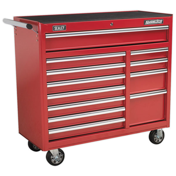 All heavy gauged steel construction and manufactured with steel inner walls for extra strength and durability. Heavy-duty 45mm ball bearing drawer slides provide superior performance and carry heavier loads. Full height rear locking mechanism, locks full-length drawers in multiple locations. Added security provided by tumbler lock, supplied with two folding keys. Rust and solvent resistant powder coat paint finish. Includes four extra-heavy-duty Ø125mm PU/PP alloy wheels, two swivel castors with large toe locks and two fixed wheels. Features a highly polished chrome handle to enable smooth manoeuvrability. Also includes a 10mm thick top mat. Each drawer features aluminium drawer pulls and non-slip liners.