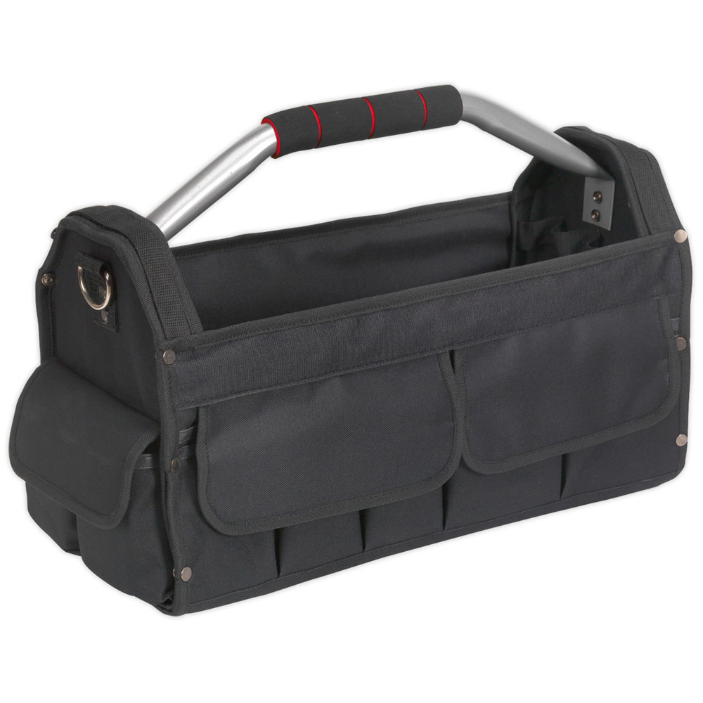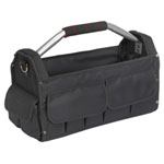 Heavy-duty tool bag. Tough polyester construction with rigid base and ends. Supported on five composite feet. Features three external open pockets and seven covered by hook-and-loop sealed flaps. Main compartment has five pockets and can be fully enclosed. Supplied with adjustable shoulder strap and foam padded metal carry handle.