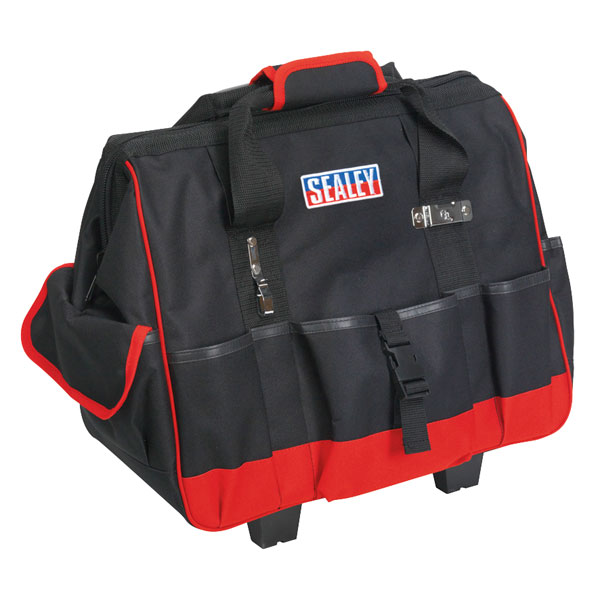 This tool storage bag on wheels from Sealey has been manufactured with tough polyester. Multiple internal and external pockets for optimum organisation. Single compartment enclosed with zip, plus two strong carry handles and extendable metal handle for easy transportation.