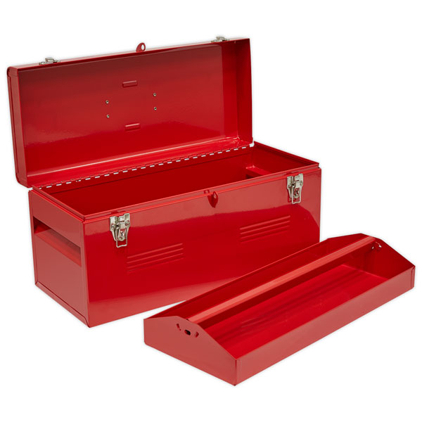Heavy-duty steel toolbox with integral tote tray and composite carry handle. Also features recessed carry handles on either end to aid lifting/transportation. Includes padlock hasp for extra security.