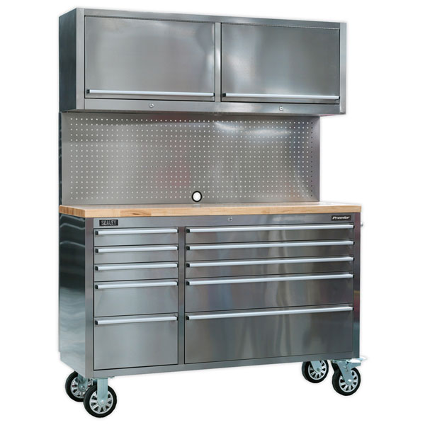 Sealey AP5520SS Mobile Stainless Steel Tool Cab 10 Drawer Backboard 2 Cupboards