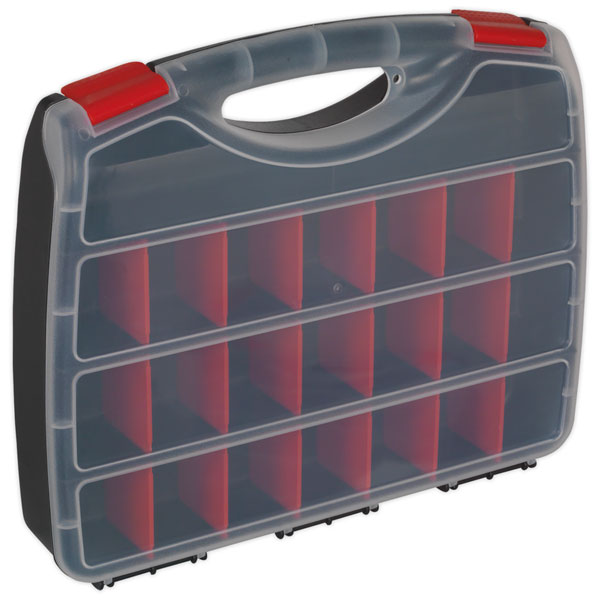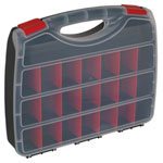 Tough impact resistant polypropylene assortment case with 23 compartments. Small section dividers can be removed when larger parts are needed to be stored. Ideal storage for various types of small, medium or large fixings, fuses and components. Clear lid for easy identification of contents. Features two tough composite locking clips and a padlock eye suitable for padlock shackles up to Ø5mm.