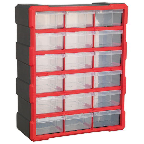 Tough and durable housing, contains 18 impact resistant composite drawers. Ideal for storing a mixture of small to large fixings and components. Fitted with four fixing points for wall mounting or can be bench mounted (freestanding).