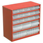 Professional quality steel frame cabinet for use in the workshop. Supplied with 20 tough polypropylene drawers which can be subdivided into smaller compartments with dividers (not included). Can be wall mounted or used freestanding.