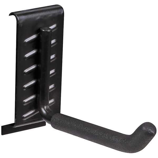 Steel single storage hook. Powder coated to prevent oxidisation. PVC Wrapped to avoid damage to tools and equipment. Designed to be used in conjunction with Wall Mountable Storage Rail Model No. APH01 for quick and easy installation and repositioning. Ideal for holding long handle tools, cleaning supplies and bags. Overall maximum load of 15kg. Dimensions: (W x D x H): 40 x 140 x 90mm.