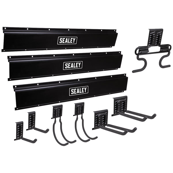 • Contains wall mountable hook rails (x3) and multipurpose hooks (x7).