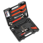 This 15-piece tool kit from Sealey is a comprehensive range of tools suitable for general maintenance and cleaning. Contains universal and manufacturer specific tools. Most of the tools you will need in one kit. Supplied in carry-case. Contents: Cassette Cleaner, Chain Cleaning Brush, Chain Rivet Extractor, Hex Keys; 1.5, 2, 2.5, 3, 4, 5, 6, 8mm, 2pc Hub Cone Spanners; 13, 14, 15, 16mm, Pedal Spanner 15mm with 14, 15mm Sockets, Shimano BB Tool, Shimano HG Cassette Remover, Spanners; 8, 10mm, Spoke Spanners; 3.4, 3.5, 3.9, 4.2, 4.4, 5mm, Sun Crank Puller, Screwdriver; Phillips #1, Plastic Tyre Levers, Puncture Repair Kit.