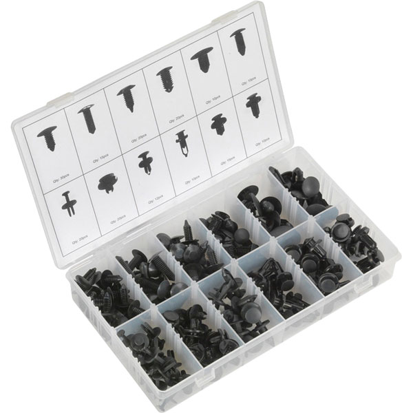 A 192-piece assortment set of trim clips from Sealey. Featuring the most common body trim clips found on GM, Ford and Honda vehicles. The clips come come supplied in partitioned storage case for easy access.