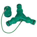 Three-way hose connector manufactured using highly durable plastic. Converts water inlet supply into two separate outlets for connecting to standard quick couplers. Fitted with blanking screw cap to block off one outlet when not in use.