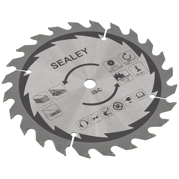 Tungsten carbide tipped (TCT) saw blade with hardened steel teeth. Suitable for cutting wood and wood-based products such as MDF and chipboard.