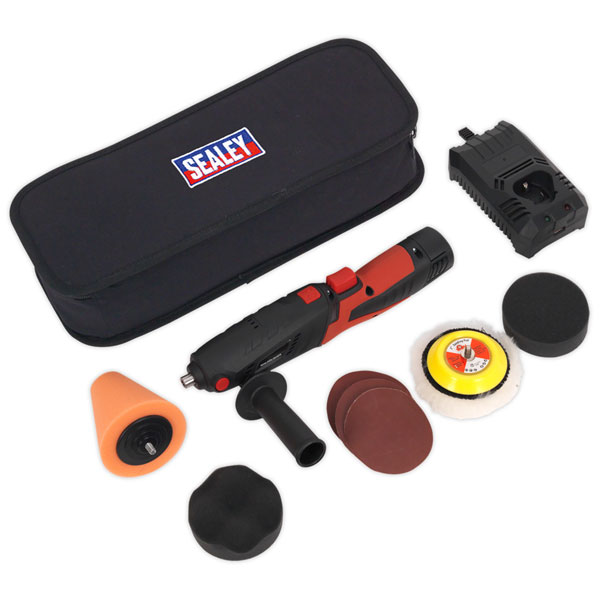 • Supplied in canvas bag with 12V Lithium-ion battery pack, battery charger and a range of polishing and sanding heads.