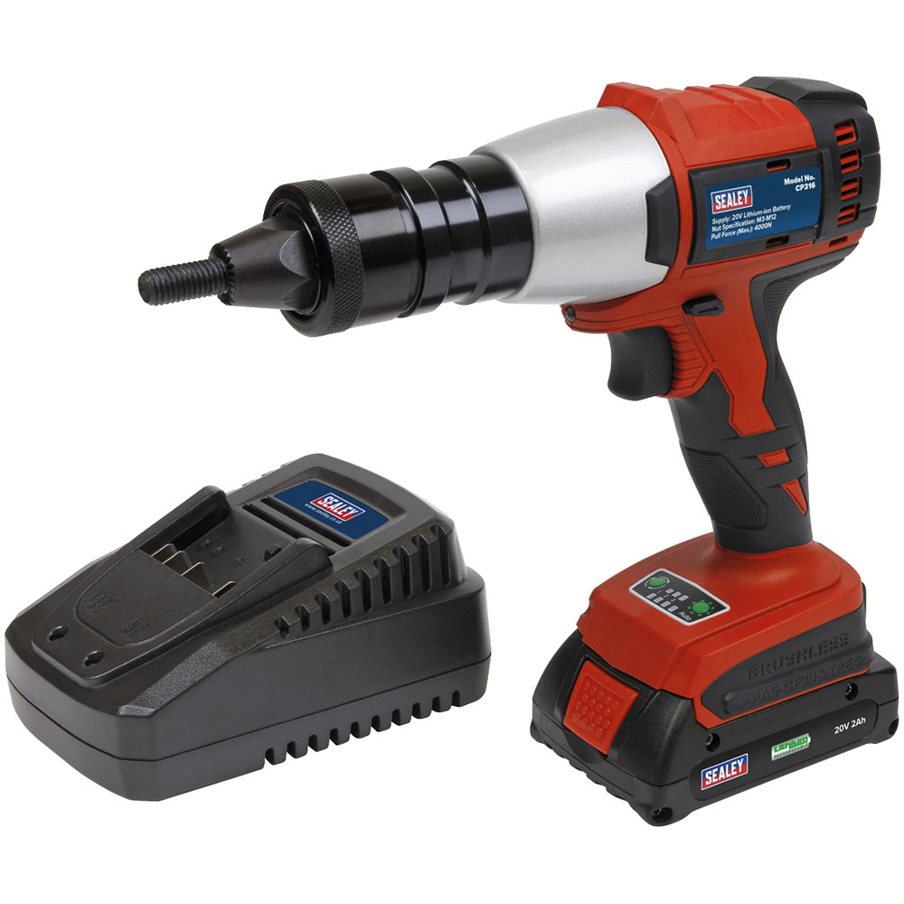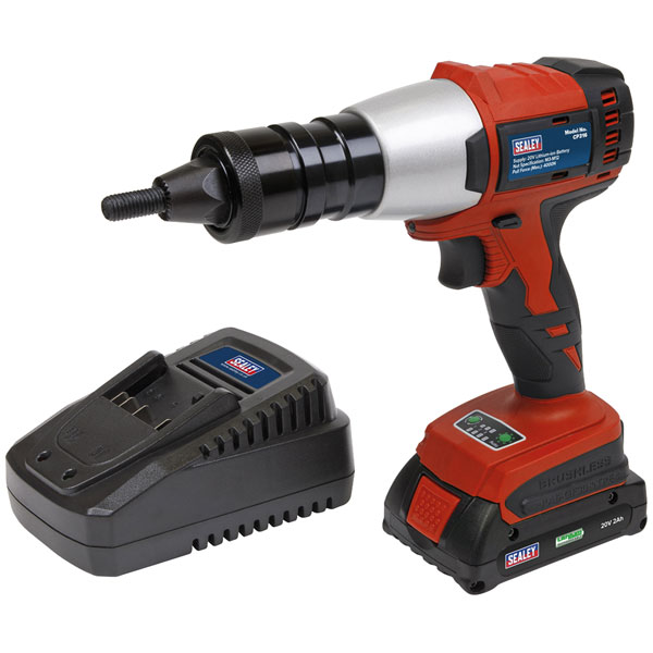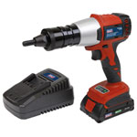 Suitable for aluminium rivet nuts. Powered by a 20V 2Ah lithium-ion battery and brushless motor with a pulling force of up to 4000N, capable of pulling up to 80 rivets on one full charge. Three selectable power settings to help preserve the battery by only supplying the force required. Quick release mechanism which allows for speedy mandrel changes. LED battery light indicator. Supplied with seven sets of threaded mandrels from M3 to M12 and fast charge mains charger. Supplied in storage case.