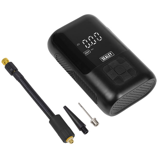 Accessory kit includes a 150mm extension tube with Schrader connection, Presta type adaptor, ball spike, inflatables adaptor and a USB charging cable.