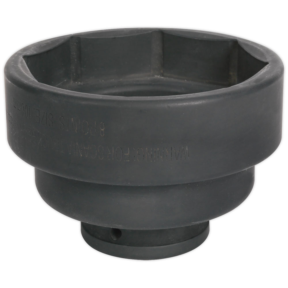 Drop-forged, 8-point, steel impact socket designed for the removal of rear hub nut found on Scania commercial vehicles.