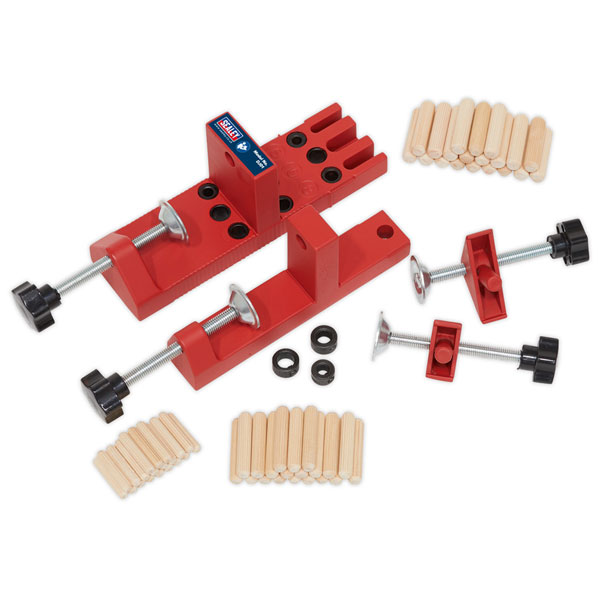 Suitable for a number of different styles of dowel joint including edge-to-edge, edge-to-corner and edge-to-surface. Set includes aluminium dowelling jig, alignment clamps, 60 dowel pins and three drill bit depth stops.