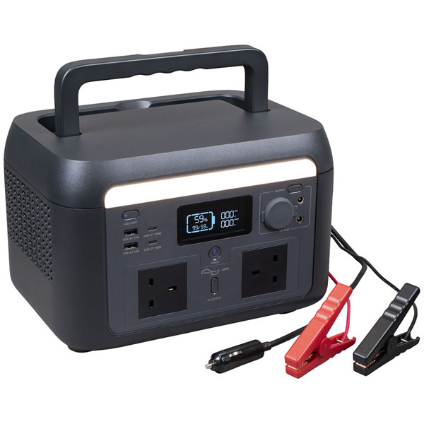 600W - Can charge an average phone battery over 30 times or supply power to a car fridge for 8.5hr (based on a 60W continuous draw).