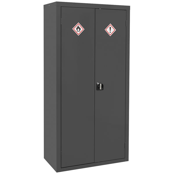 Sturdy metal construction with grey powder coat. Supplied with a pack of appropriate warning labels. Two door, fitted with 2-point key lock and supplied with two keys. Features three adjustable, lipped shelves and liquid-tight base to retain spills. 155mm Raised, leak-proof door sill.