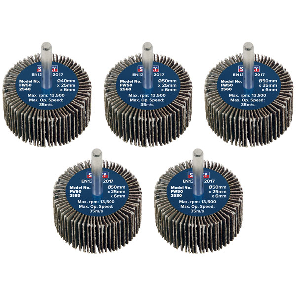 Sealey FW5025ASS 50 x 25mm Abrasive Flap Wheel on 6mm Shaft Assorted Grit - PK 5