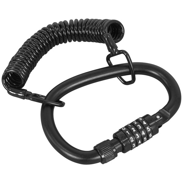 Powder paint coated carabiner and vinyl coated cable to protect the bike and clothing.