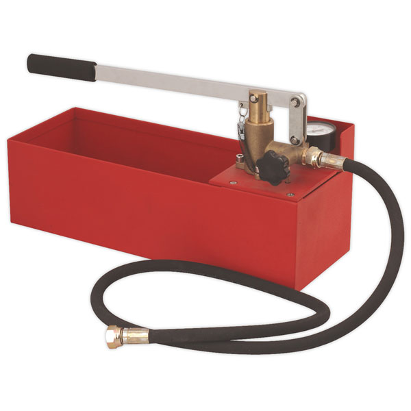 Hand operated tester suitable for testing heating system integrity and locating leaks and blockages. Fast, simple and reliable operation. Water filter prevents ingress of debris into the heating system. Rugged construction features rubber bumper on pressure gauge and contoured pump grip.
