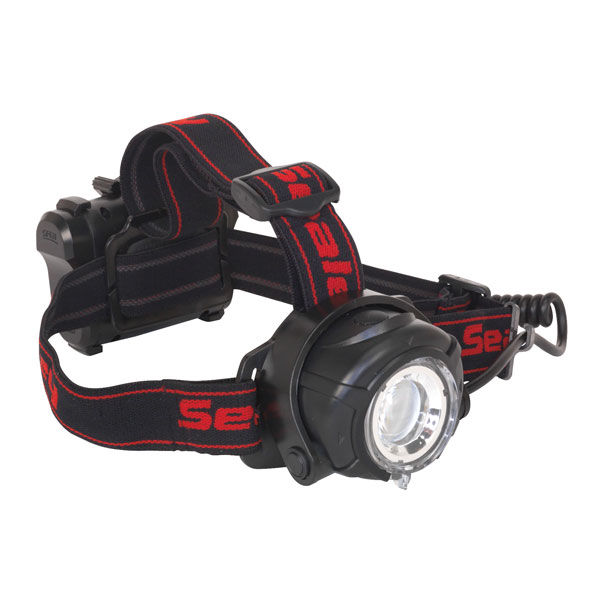 This LED head torch from Sealey offers adjustable focus and brightness and features an additional rear red warning light.