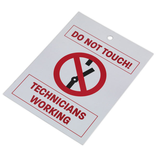 Safety warning tag for placing with hybrid or electric vehicle keys whilst service or repair operations are being carried out. It is essential that the vehicle keys are kept secure and away from the vehicle during service or repair work. 80 x 110mm 400gsm paper with gloss finish.