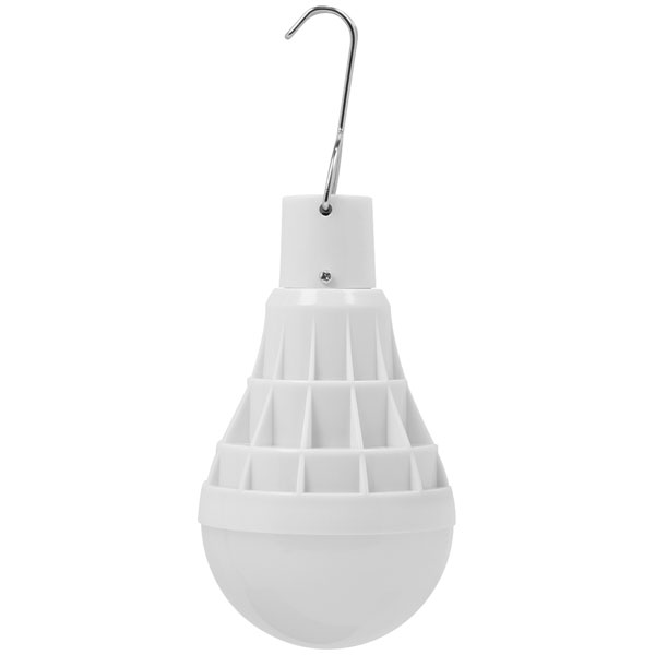 Rechargeable LED bulb ideal for camping or emergency situations. Operates 14 SMD LEDs that feature five selectable light settings. Features 3.7V 1.2Ah Li-ion rechargeable battery for up to 3 hours operating time on its highest setting. Produces up to 170 lumens. Built-in hanging hook for hands-free applications.