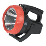Weatherproof composite cased spotlight with swivel handle feature allowing pistol grip or carry handle operation. Integral adjustable foot doubles as carry handle when used in pistol grip mode. Ø125mm Lens with 5W CREE LED bulb produces 5-million candlepower (450 lumen) with two selectable modes of brightness lasting up to 8hrs on one charge. Suitable for a wide variety of applications. Supplied with 6V 2.5Ah sealed battery, in-car charger and 230V mains charger.