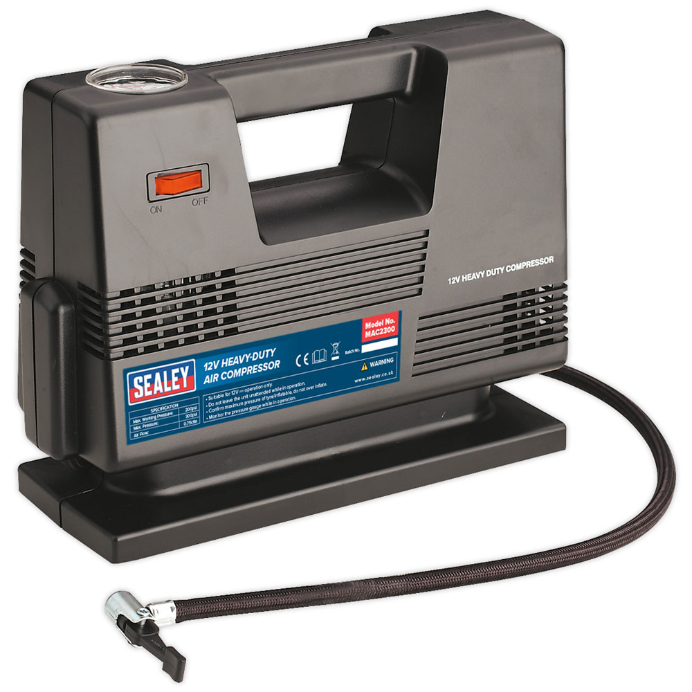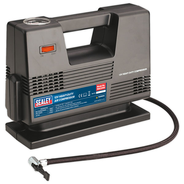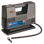 Housed in rugged composite case. Suitable for inflating tyres on cars, vans and 4x4s. Powered by reliable, heavy-duty motor compressing free air to 30psi at the rate of 45ft³/hr. Integral gauge. Supplied with plug for use in vehicle accessory power socket. Accessory kit, containing Presta type adaptor, ball spike and two inflatables adaptors included in storage compartment on base.
