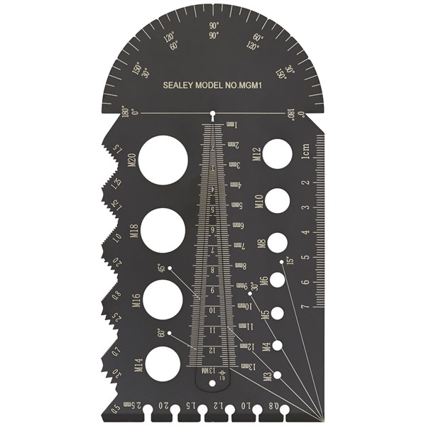 • • Stainless steel metric multifunction thread/pitch identification gauge. • Pitches: 3, 2.5, 2, 1.75, 1.5, 1.25, 1, 0.8, 0.7, 0.5mm. • Bolt Screw Diameters: M3, M4, M5, M6, M8, M10, M12, M14, M16, M18, M20. • Wire Gauge: 0.8, 1, 1.2, 1.5, 2, 2.5mm. • Square: 15°, 30°, 45°, 60°, 90°. • Bolt Screw Length: 0-7cm. • Tap/Drill Recommendation: M3-M20. • Checks the thickness of washers and diameter of electric wire. • Model No. MGM1