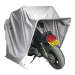 Made with 600D polyester Oxford waterproof material, designed never to touch your motorcycle and protects against damaging UV rays. Covered ventilation on both sides of the shelter allow for air flow to help reduce condensation. Fitted with a locking mechanism with eyelet for use with padlock (not included). Supplied with soft ground anchors. There are three sizes available to fit most motorcycles, ATVs, trikes or even ride on lawn mowers.