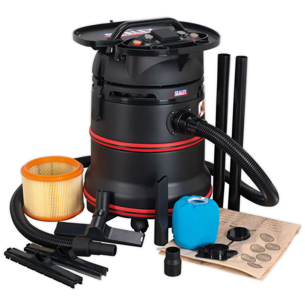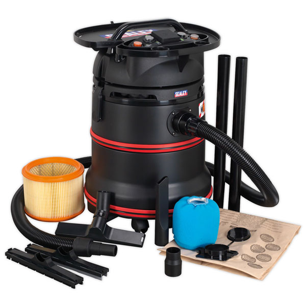 High powered unit designed for use with power tools. Certified for Class M dust extraction in accordance with EU directives, which protects the operator from dust particles hazardous to health. Supplied with Ø36mm flexible hose, crevice nozzle, multi-diameter tool adaptor, inserts for liquid collection and hard floors, power tool cord clamps, Class M bag filter, Class M cartridge filter and foam filter. Can be set to continuous suction or in synchronisation with a power tool via a 2000W rated, electronically controlled outlet. Fitted with a self-cleaning filter designed to prevent filter blockages whilst in use. Fitted with four castors for manoeuvrability.