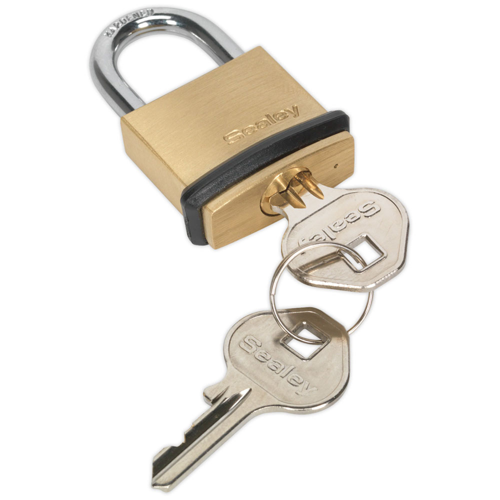 Key operated padlock with corrosion resistant solid brass body and hardened steel shackle. Lever locking mechanism and precision pin tumbler brass cylinder. Bumper surround prevents damage to locked item. Supplied with 2 keys.