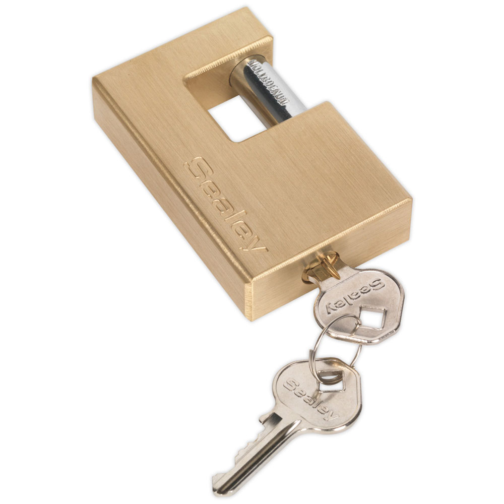 Shrouded shackle "shutter" padlock. Corrosion resistant solid brass body. Chrome Molybdenum shackle. Precision pin tumbler cylinder with anti-pick mushroom pins. Supplied with two keys.