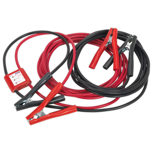 Surge and spike protection, fitted in-line with heavy-duty booster cables. Clever traffic-light LEDs show when protection is in place and it is safe to proceed jump-starting.