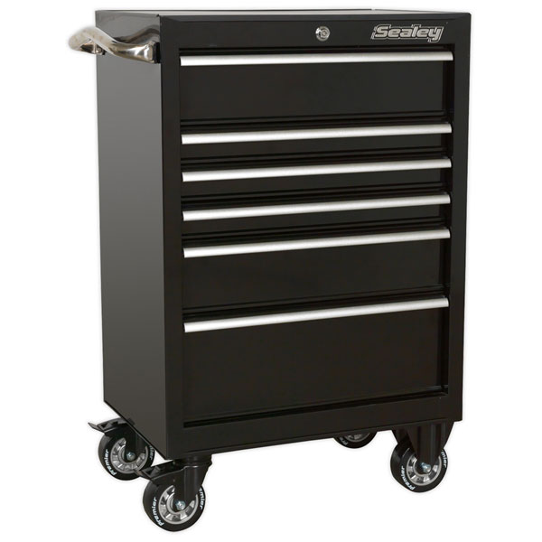 Heavy-duty welded steel construction for strength and durability. Textured powder coat finish, both solvent and rust resistant. Ball bearing drawer slides provide superior performance and carry heavier loads, double sets on large drawers. All drawers have full width sand blasted aluminium 'Lift & Latch' drawer pulls, making easy access while preventing inadvertent opening when box is being moved. Tubular chrome plated exterior side handle. Non-slip drawer liners supplied for all drawers. Heavy-duty Ø125mm Mag style castors, 2 swivel with toe brakes and 2 fixed on rollcabs. Integral locking system locks all drawers with the turn of 1 key. Supplied with 2 keys. Supplied with 12mm PVC coated MDF worktop for use as a workbench when not used with a topchest. Use with Model No. PTB66004 Topchest or as a stand alone unit.