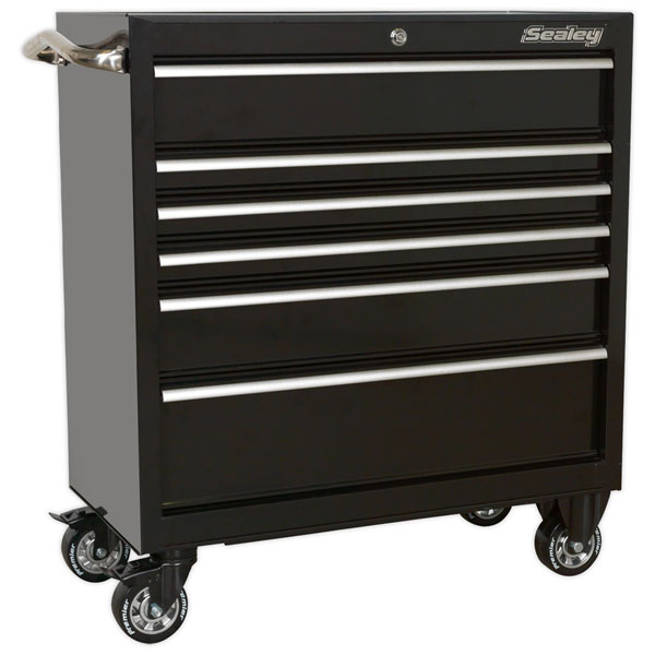 Heavy-duty welded steel construction for strength and durability. Textured powder coat finish, both solvent and rust resistant. Ball bearing drawer slides provide superior performance and carry heavier loads, double sets on large drawers. All drawers have full width sand blasted aluminium 'Lift & Latch' drawer pulls, making easy access while preventing inadvertent opening when box is being moved. Tubular chrome plated exterior side handle. Supplied with non-slip drawer liners fitted to each drawer. Heavy-duty Ø125mm Mag style castors, 2 swivel with toe brakes and 2 fixed. Integral locking system locks all drawers with the turn of a key. Supplied with 2 keys. Supplied with 12mm PVC coated MDF worktop for use as a workbench when not used with a topchest. Use with Model No. PTB91508 Topchest or can be a stand alone unit.