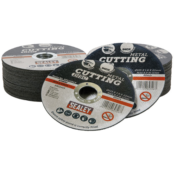 • • General-purpose flat cutting disc recommended for use with Sealey and other leading makes of grinding and cutting power tools. • Suitable for cutting stainless steel. • Pack of 50. • Model No. PTC/115CT50