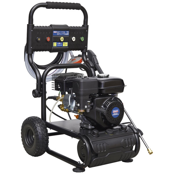 - Petrol powered pressure washer with recoil starting.