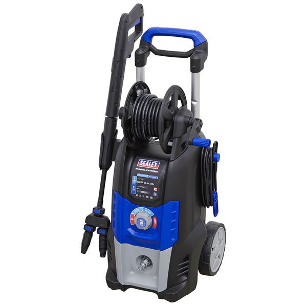 - Supplied with 8m high pressure hose and reel, detergent bottle, 5m power cable and heavy-duty wheels.