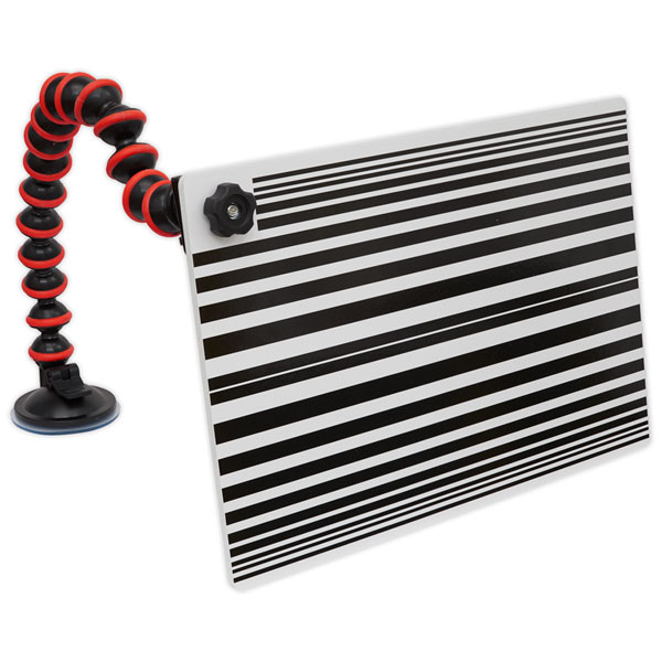 To be used alongside other dent repair tools for added accuracy. Suction cup and flexible neck provides precise positioning. Reflected lines distort when aligned over damaged area, providing visual aid when dressing the panel.