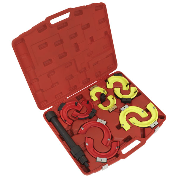Suitable for MacPherson strut coil springs. Supplied with five pairs of different sized interchangeable yokes, for right/left-handed coil springs. Plastic yoke protectors that protect the spring coating from damage, which can invalidate the vehicle manufacturer's guarantee. Safety yokes carefully shaped to stop the spring bowing while under compression.
