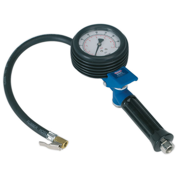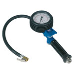 Composite body and dial type jumbo gauge with rubber protector. Calibrated in bar and psi. Fitted with 400mm rubber hose and single clip-on connector.