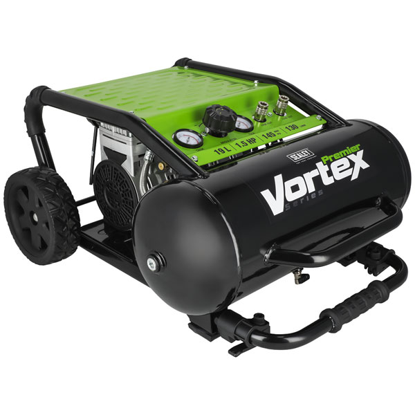 Fitted with fully automatic pressure cut-out switch and twin gauges displaying tank and working pressures.